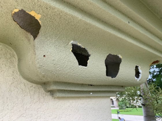 ABSOLUTE WILDLIFE CONTROL utilizes a proprietary blend of fiber and polymer modified resin mix to fill holes caused by woodpeckers and create a hard shell over the foam trim.